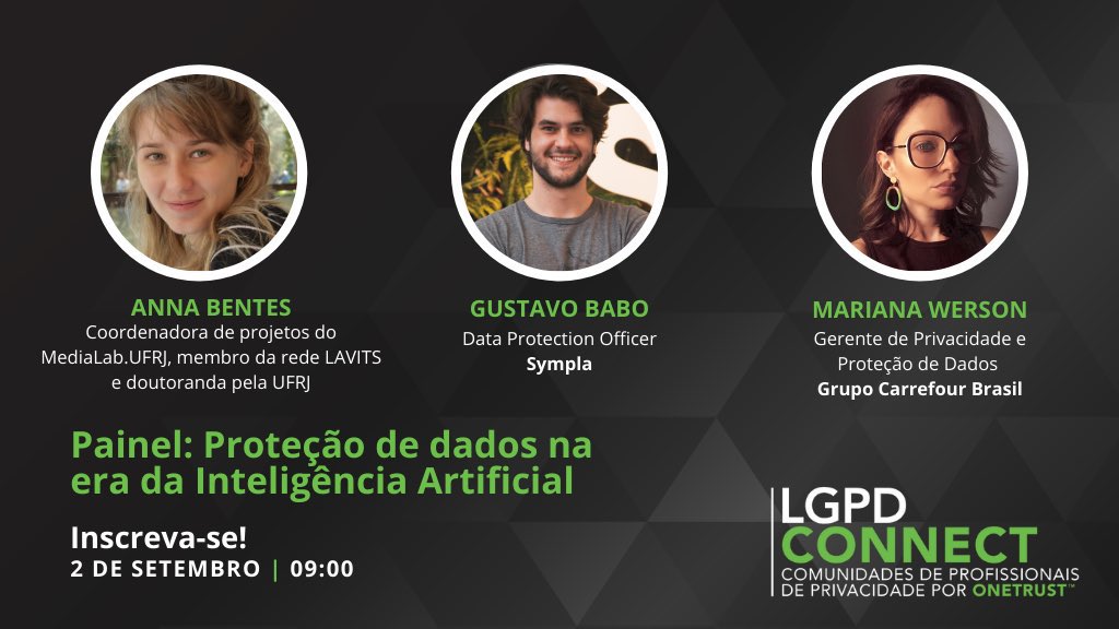 Na quinta-feira, dia 2 de setembro, às 9h, Anna Bentes vai participar do painel “Proteção de dados na era da Inteligência Artificial”, no LGPDConnect organizado pela OneTrust Brasil. O painel conta também com a participação de Gustavo Babo (Data Protection Officer – Sympla) e Mariana Werson (Gerente de Privacidade e Proteção de Dados – Grupo Carrefour Brasil).