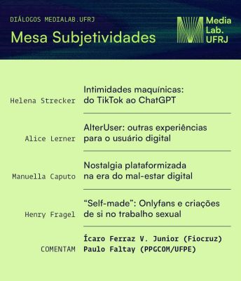 A mesa Subjetividades reúne as apresentações de Helena Strecker, Alice Lerner, Manuella Caputo e Henry Fragel. Na sequência, Ícaro Ferraz V. Junior e Paulo Faltay comentarão as pesquisas.