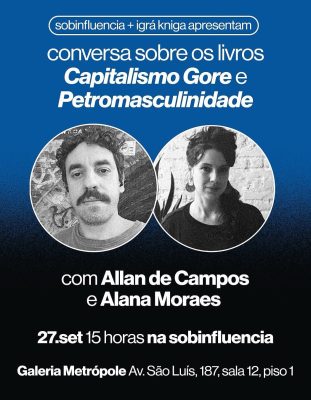 No próximo sábado, 27 de setembro, a partir das 15h, as editoras Sobinfluencia e Igrá Kniga recebem Alana Moraes e Allan de Campos para uma conversa sobre os livros “Capitalismo Gore”, de Sayak Valencia, e “Petromasculinidade”, de Cara New Daggett.
