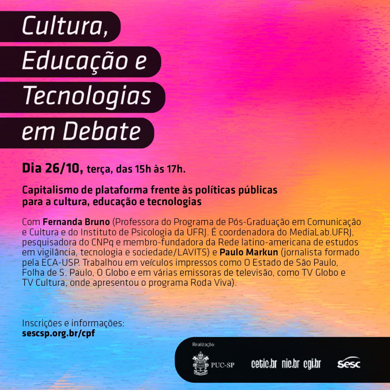 Fernanda Bruno participou no dia 26/10 do último encontro da edição do Ciclo Cultura, Educação e Tecnologias em Debate que é uma parceria entre Cetic.br|NIC.br, PUC-SP e Sesc, e tem a coordenação do professor Fernando Almeida. O encontro será sobre “Capitalismo de Plataforma frente às Políticas Públicas para Cultura, Educação e Tecnologias”, conta com a mediação de Paulo Markun (jornalista e apresentador).