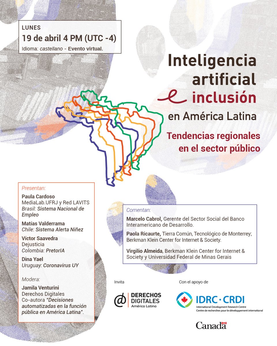 No dia 19.04, foi lançado o projeto “Inteligencia Artificial e inclusión en América Latina. Tendencias regionales en el sector público”, coordenado pela Derechos Digitales com quatro casos de adoção de IA: Brasil, Chile, Colombia e Uruguai.
